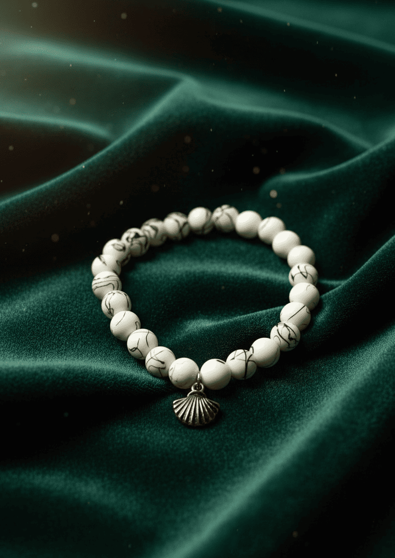 This elegant stretch bracelet features smooth, polished white glass beads that are beautifully veined with a contrasting black “marble” pattern, giving each bead a unique, organic look. The classic black and white combination makes it incredibly versatile, easily pairing with both casual and formal attire.